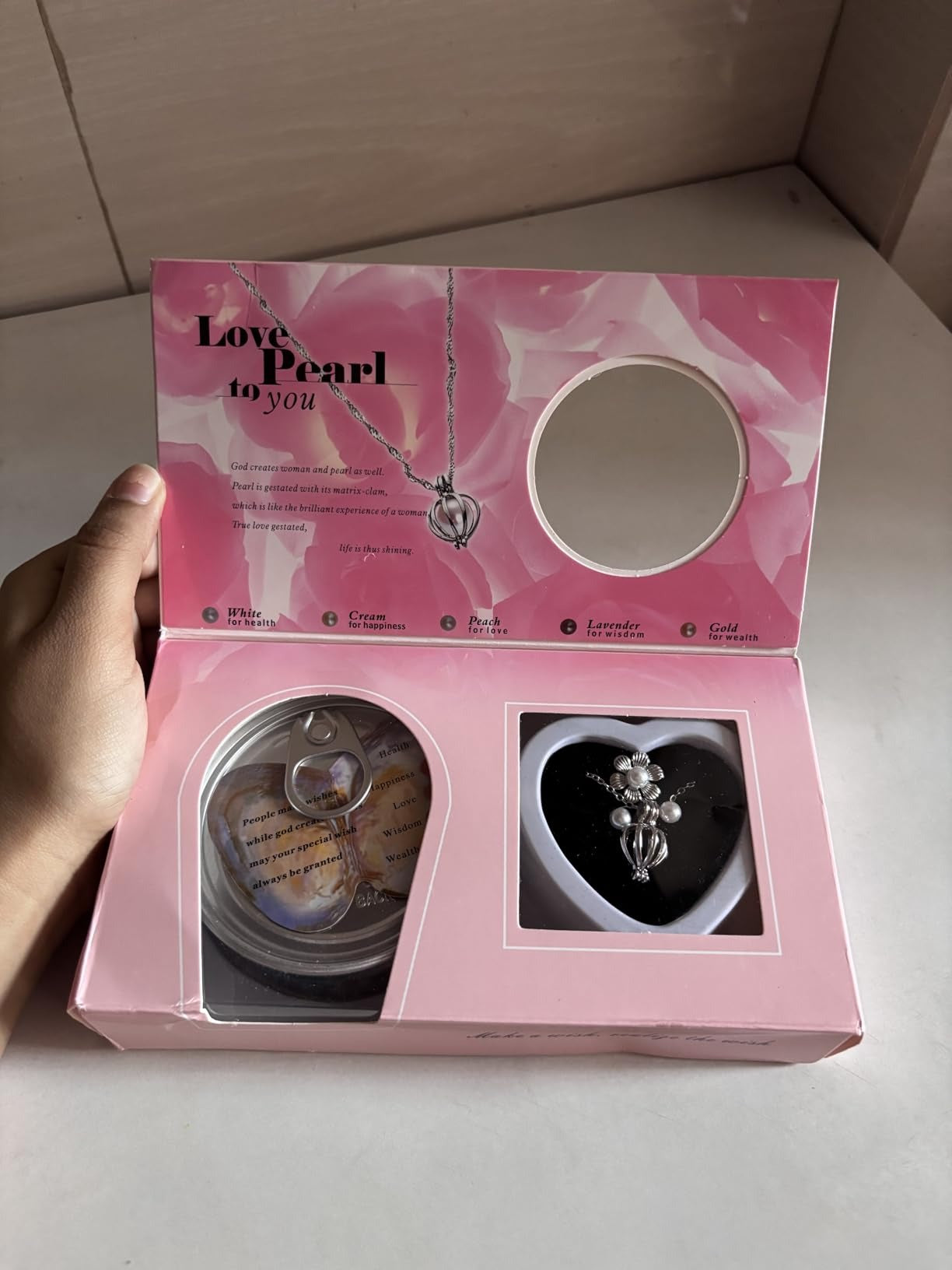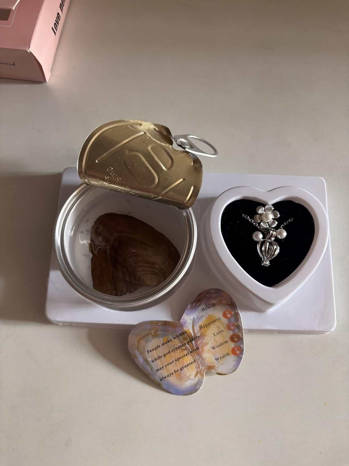 Open the oyster, reveal a real pearl, and place it inside the necklace for a truly personal touch.