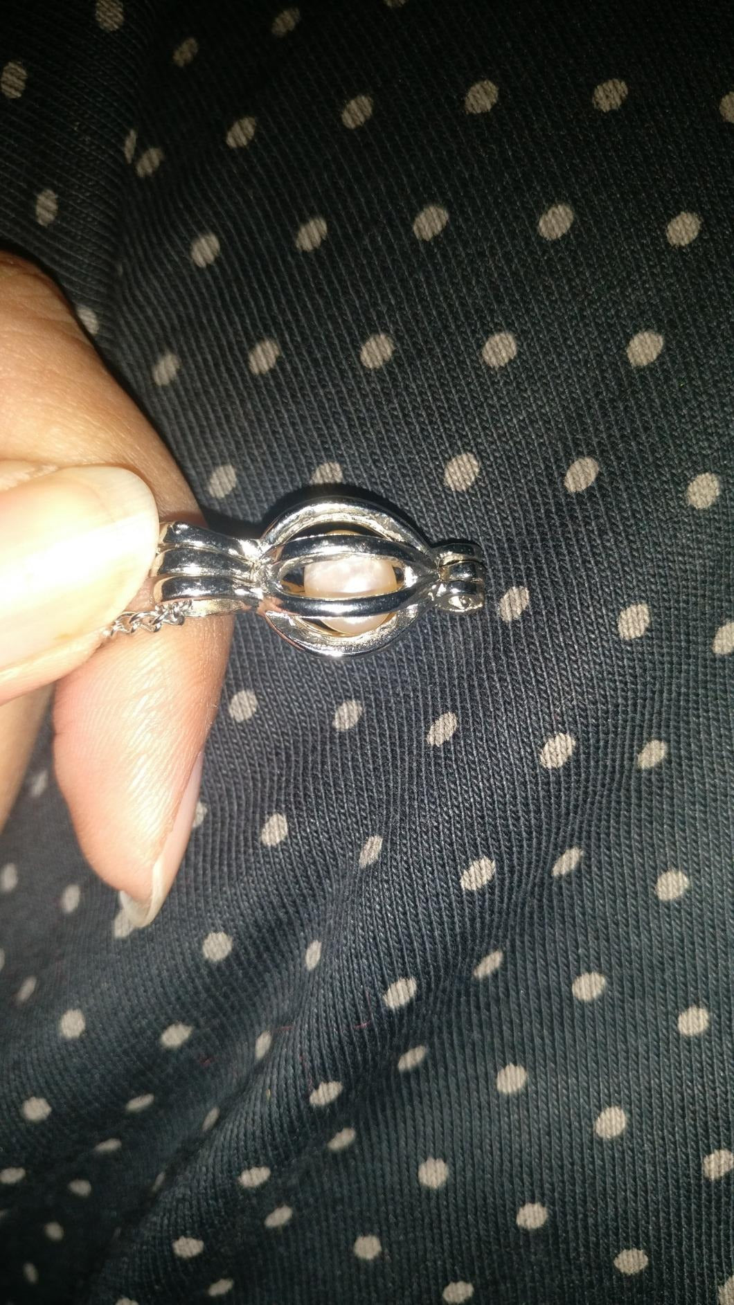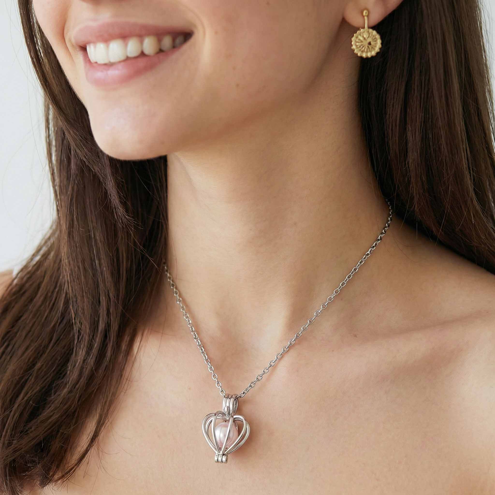 You open the oyster to reveal the pearl, then place it inside the necklace cage for a personalized touch.